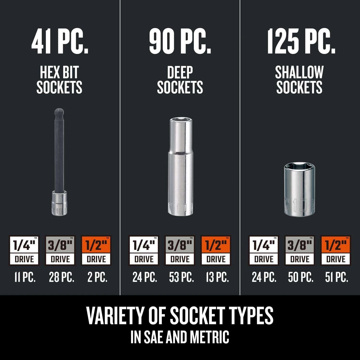 | What's Included | (90) Deep Hand Sockets, (125) Shallow Hand Sockets, (41) Hex Bit Sockets, (32) Torx Bit Sockets, (5) Slotted Bit Sockets, (6) Phillips Bit Sockets |