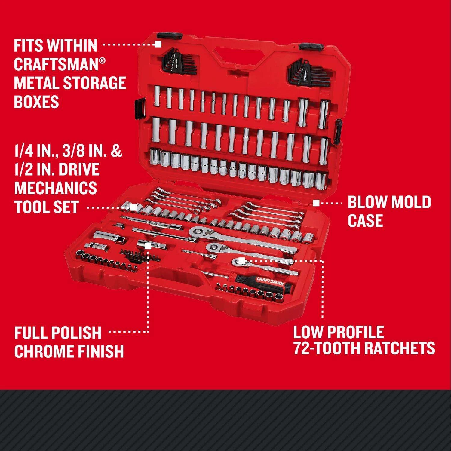 | What's Included | (10) 1/4-in. Drive Shallow 6 PT Sockets SAE – 5/32-in., 3/16-in.,7/32-in., 1/4-in.,9/32-in., 5/16-in., 11/32-in., 3/8-in., 7/16-in., 1/2-in.; (9) 1/4-in. Drive Shallow 6 PT Sockets MM -4, 5, 6, 7, 8, 9, 10, 11, 12MM; (1) 1/4-in. Drive Ext Bar – 3-in.; (1) |