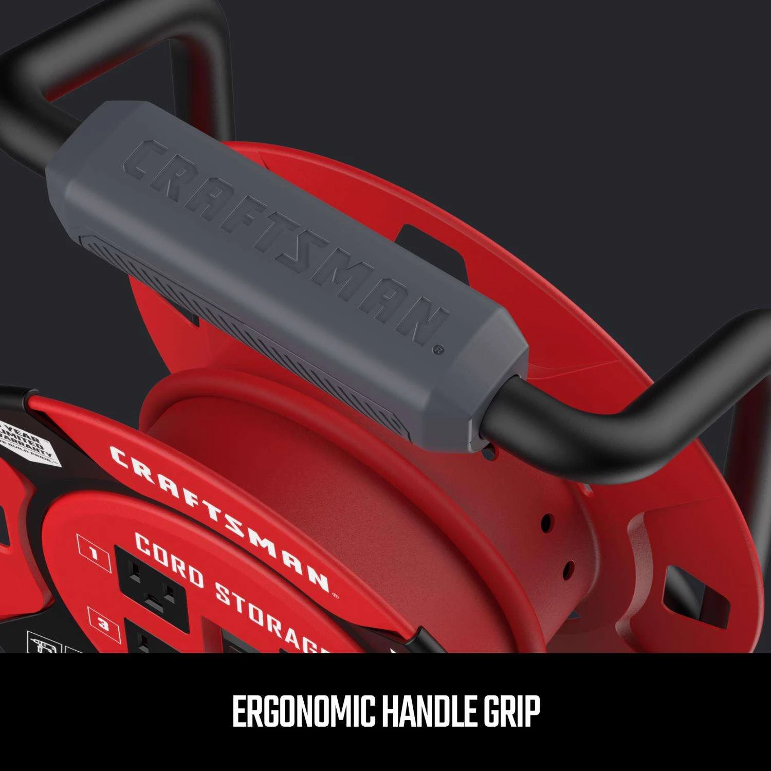 Always supply the power you need while working outside with this extension cord reel with outlets from Craftsman This convenient retractable electric cord reel features a 1-foot, 14AWG cable that makes it ideal for large outdoor spaces and provides heavy-duty power to equipment and tools. This retractable power extension cord includes 4 grounded outlets and a handy on/off switch with a power light indicator. It has a strong, heavy-duty design that is easily stored away when not in use, and a comfortable, ergonomic handle so that you can take it anywhere. At Craftsman, we have made it our mission to provide high-quality household products and retractable electric cord reels that suit the needs of our customers. We have earned a reputation for quality, ingenuity, and value that you can depend on. Our CSA-certified electric cord extension is the perfect solution to provide power while you’re working in your yard or garden so that you always have enough outlets for power tools, snow blowers, electric lawnmowers, and more. Always have the power you need anywhere with the Craftsman extension cord with multi-outlets. Tangle-free cord management this retractable cord reel features a sturdy, easy-grip handle so that you can easily wind your extension cords and keep everything organized Built-in circuit breaker designed to protect your devices and equipment, this retractable extension cord reel includes a built-in circuit breaker with overload protection It will automatically go off if the rated current or voltage is exceeded
