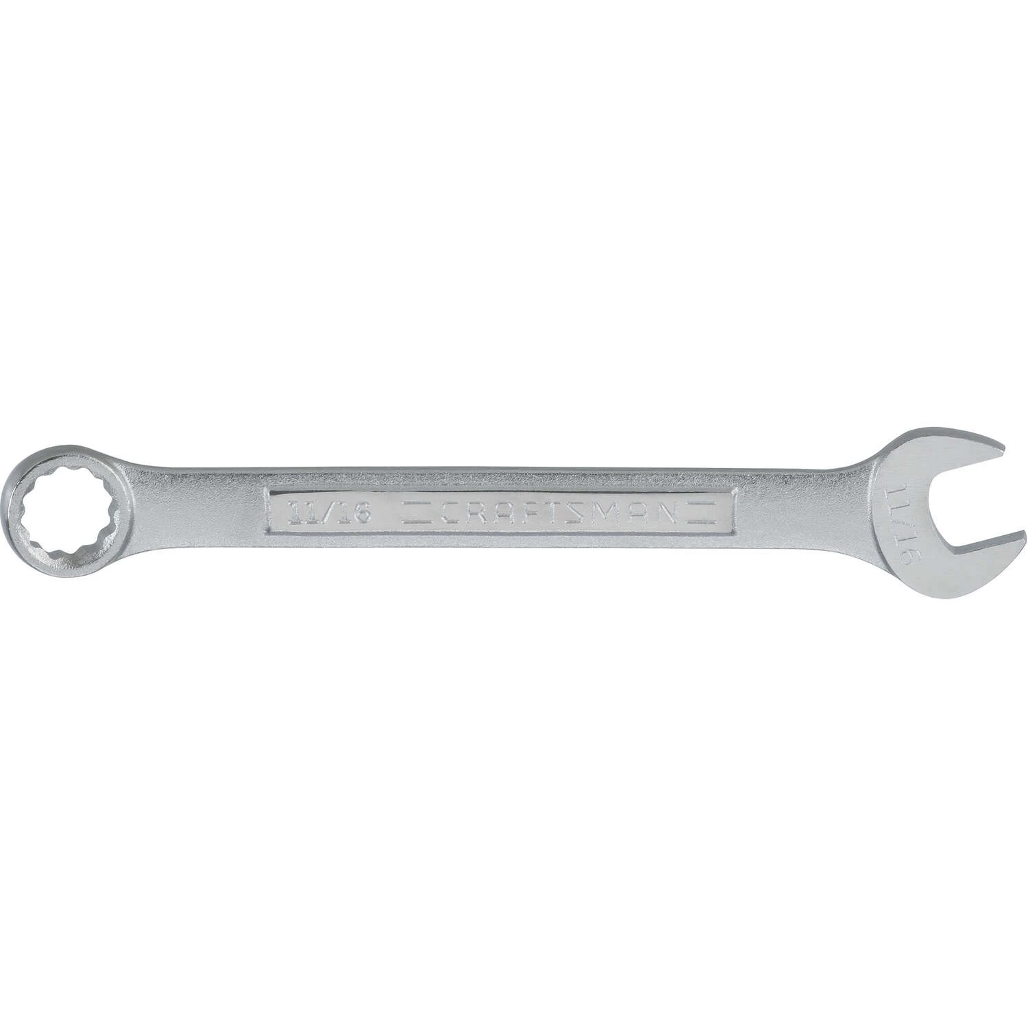 11/16-in. Standard SAE Combination Wrench has a corrosion resistant chrome finish providing extra wear and tear coverage while adding hardness and durability allowing your wrench to last longer. CRAFTSMAN® wrenches meet or exceed ASME specifications. CORROSION RESISTANT: Chrome finish for corrosion resistance QUICK ENGAGEMENT: 12 point box end for quick engagement with fastener KNUCKLE CLEARANCE: 15 box end offset for additional knuckle clearance EASY IDENTIFICATION: Large markings for quick combination wrench identification Meets or Exceeds ASME Specifications
