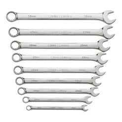 Metric fasteners are a part of everyday life for most mechanics and automotive hobbyists and the Craftsman professional 9 piece metric combination wrench set makes the easy to manipulate. These wrenches feature long handles and a single-piece construction for outstanding leverage even on tough bolts. The long pattern on the open head makes it easier to reach bolt heads in tight or otherwise inaccessible areas. A box end on each wrench lets you choose the best option for maneuverability for every bolt. This professional 9 piece metric combination wrench set consists of nine of the most common metric sizes, ranging from 8 mm to 18 mm. High-quality construction gives a snug fit on each bolt, making it easier to manipulate without slipping or rounding out the bolt. Each wrench is made from tempered steel alloy for heavy use without cracking or breaking. A full polish finish keeps the set looking professional while guarding against corrosion. 12 point box head or 3 point open head for the best fit for every bolt Long handle and long open-head pattern make it easy to reach bolts in tight areas without losing leverage One-piece design offers efficient torque transfer to easily loosen tough bolts without damaging your tools Snug fit prevents rounding or stripping the bolt head so it’s just as easy to work with next time Full polish finish