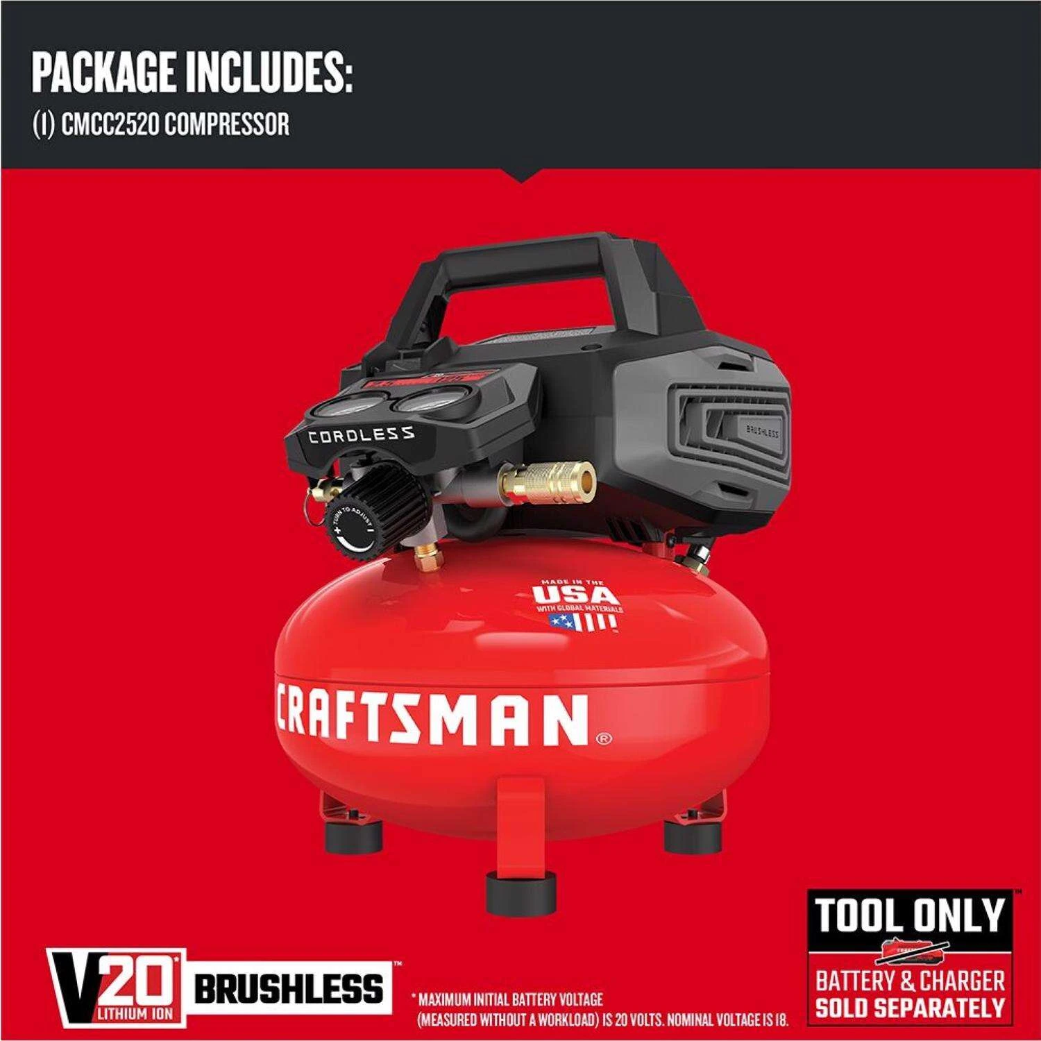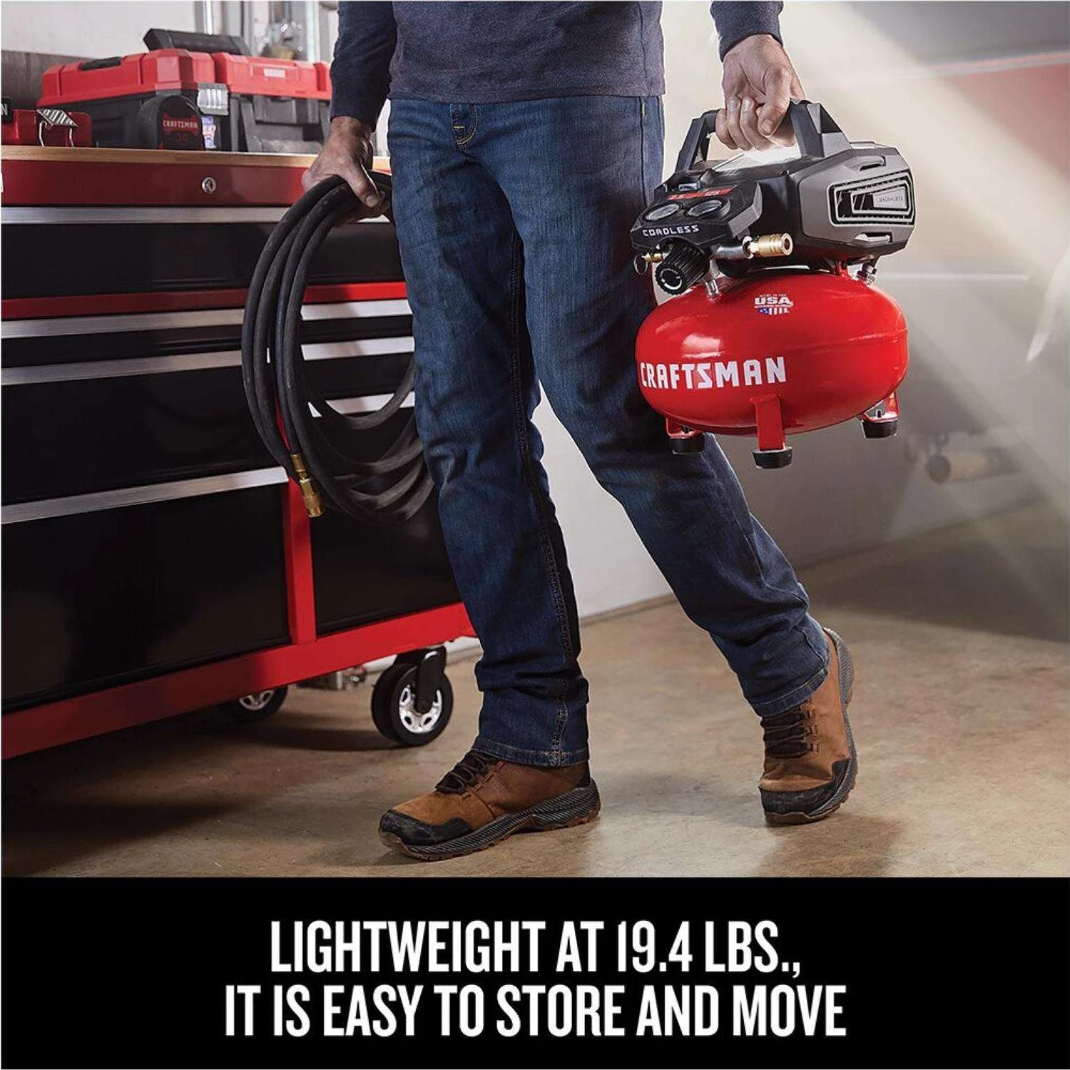 Embrace the convenience and portability of a cordless tool without sacrificing power. The V20 2.5 Gallon Brushless Cordless Air Compressor offers all the cordless benefits while allowing you to continue using the pneumatic tools you already own. Each battery (battery sold separately) charge drives up to 700 nails, giving you the runtime you need to increase your workload. Power adapts to job size tackle workloads with 125 PSI and 1.0 SCFM at 90 PSI Top tier performance durable oil-free pump delivers corded power in a cordless solution Maneuver with ease lightweight tool that moves conveniently around your workspace