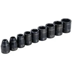 9 pc. 3/8-in. SAE Impact Socket Set is engineered and constructed to endure high torque application with impact wrenches. These impact socket are specially designed to engage with the flats of fasteners to prevent rounding so it’s time to turn up the torque and turn tough jobs into easy ones. CORROSION RESISTANT: Black Oxide Finish INCREASED TORQUE: 6 Point Socket with fastener QUICK SIZE IDENTIFICATION: Large Markings Meets or exceeds ASME specifications