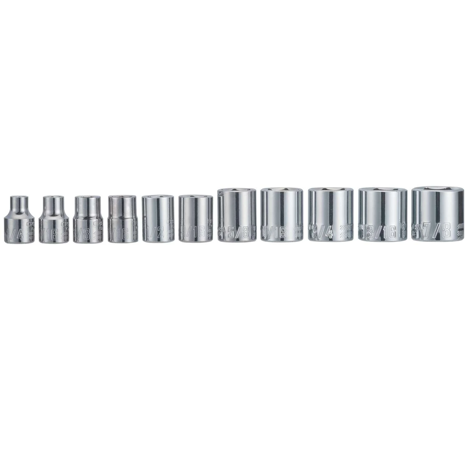 | What's Included | (11) 3/8-in. Drive Shallow 6 PT Sockets SAE – 1/4-in. , 5/16-in. , 3/8-in. , 7/16-in. , 1/2-in. , 9/16-in. , 5/8-in. , 11/16-in. , 3/4-in. , 13/16-in. , 7/8-in. |