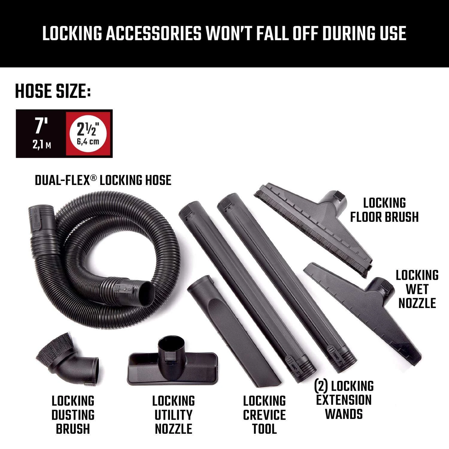 | What's Included | (2) 2-1/2 in. Locking Extension Wands, (1) 2-1/2 in. Locking Utility Nozzle, (1) 2-1/2 in. Locking Floor Brush, (1) 2-1/2 in. Locking Wet Nozzle, (1) 2-1/2 in. Locking Dusting Brush, (1) 2-1/2 in. Locking Crevice Tool, (1) 2-1/2 in. x 7 ft. Locking Hose |