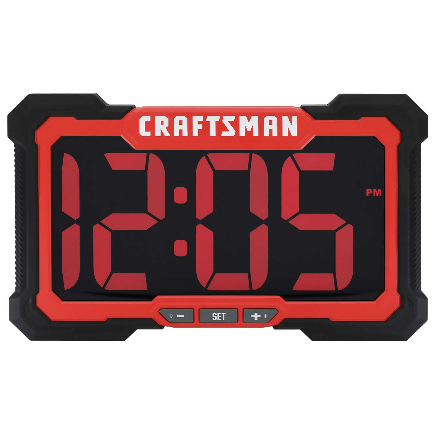 This CRAFTSMAN 11” LED Digital Clock provides the current time in any room, garage, basement, or workshop with large, LED digits. Five different brightness levels let you decide how bright or how dim you’d like the time to be displayed. This clock includes an integrated fold-out stand for placement on any flat surface, integrated keyhole hangers to mount as a wall clock, and two VERSATRACK hooks and screws to hang on your CRAFTSMAN VERSATRACK Trackwall System. The dimensions of this clock are 7” H x 11.35” W x 1.8” D. This CRAFTSMAN 11” LED Digital Clock is AC powered with a built-in space to store excess cord length. Insert two AAA alkaline or lithium batteries into the back of this clock to save your settings in case the clock unplugs or loses power. This product comes with a one-year limited warranty. Easily read the time from across the room, garage or workshop Choose between five brightness levels to fit your needs Hang next to your other Craftsman tools and equipment for an organized look Use the fold-out stand for tabletop placement or the integrated keyhole hangers for wall mounting Hide excess cord length with a built-in cord storage area Use 2 AAA alkaline or lithium batteries (not included) to save your settings in case of a power outage