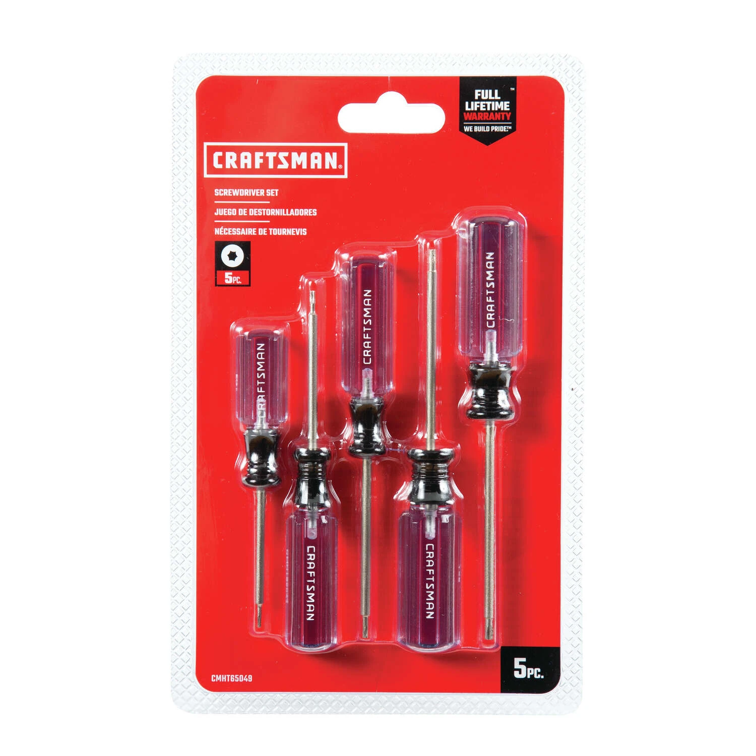 Craftsman 5 pc. Mini Torx Acetate Screwdriver Set features heat-treated, alloy steel blades for increased durability. A comfort optimized handle is ideal for high and low torque applications. Blades and shafts are coated with a satin-nickel finish to resist corrosion. STRENGTH AND DURABILITY: Made of heat-treated alloy steel COMFORT OPTIMIZED HANDLE: For high and low torque application Satin-nickel finish