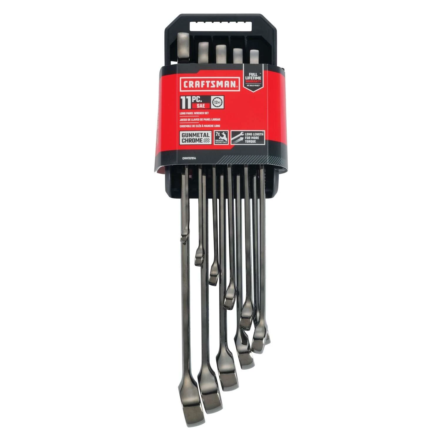 The Craftsman 11 pc. SAE Long Panel Gunmetal Chrome Combination Wrench Set offers a number of applications from standard bolt turning to specific automotive repairs. SUPERIOR DURABILITY: Gunmetal Chrome gives it superior rust resistance 7X GRIPPING POWER: Anti-slip wrenches QUICK ENGAGEMENT: 12-point box makes it easy to engage the fastener ADDITIONAL KNUCKLE CLEARANCE: 15 box end offset