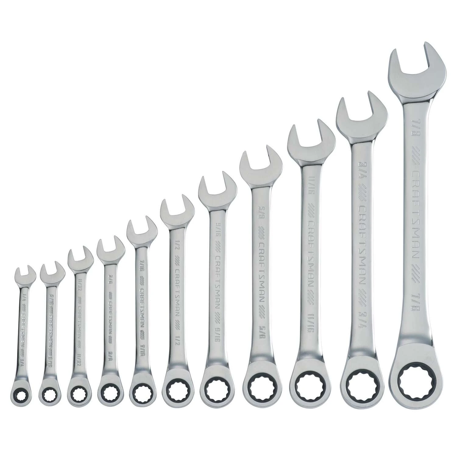 The Craftsman 11 pc. SAE Ratcheting Combination Wrench Set offers a number of applications from standard bolt turning to specific automotive repairs. CORROSION RESISTANCE: Full-polish chrome finish QUICK ENGAGEMENT: 12-point box makes it easy to engage the fastener ADDITIONAL KNUCKLE CLEARANCE: 15 box end offset ACCESS TO TIGHT SPACES: 72-tooth ratcheting box end helps you get in to hard-to-reach-places QUICK SIZE IDENTIFICATION: Large markings Meets or Exceeds ASME Specifications
