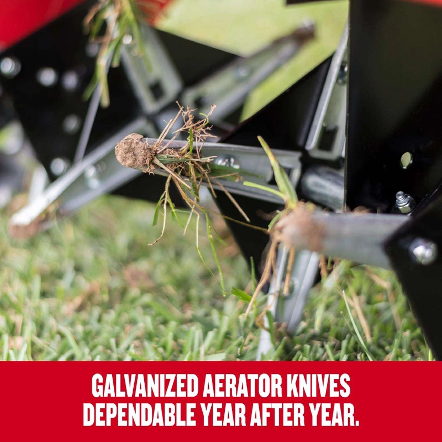 The 40-in. Plug Lawn Aerator loosens tough, compacted soil promoting a healthy, lush lawn. When you aerate your lawn, you are opening up the soil surface which allows more water, air and nutrients to reach the grass roots. This plug aerator covers a 40 in. path in a single pass and penetrates deep into the soil to pull 3/4 in. plugs up to 3 in. in depth. This aerator has a universal design that fits any brand riding mower. 24-in. galvanized steel coring points pull plugs from your lawn up to 3 inches deep preparing soil for spring or fall planting Wide width weight tray supports up to 140 lb. of ballast for tougher coring action Release on the lift handle with easy-to-store design that can be stored against a wall Flat free tires roll smoothly over your lawn Prepares soils for spring or fall planting Durable heavy-gauge steel deck and welded draw bar Simple-to-use cantilever transport handle for easy raising and lowering An easy-to-store design lets you store it against your garage or shed wall Large 40-in. working width covers larger areas at once