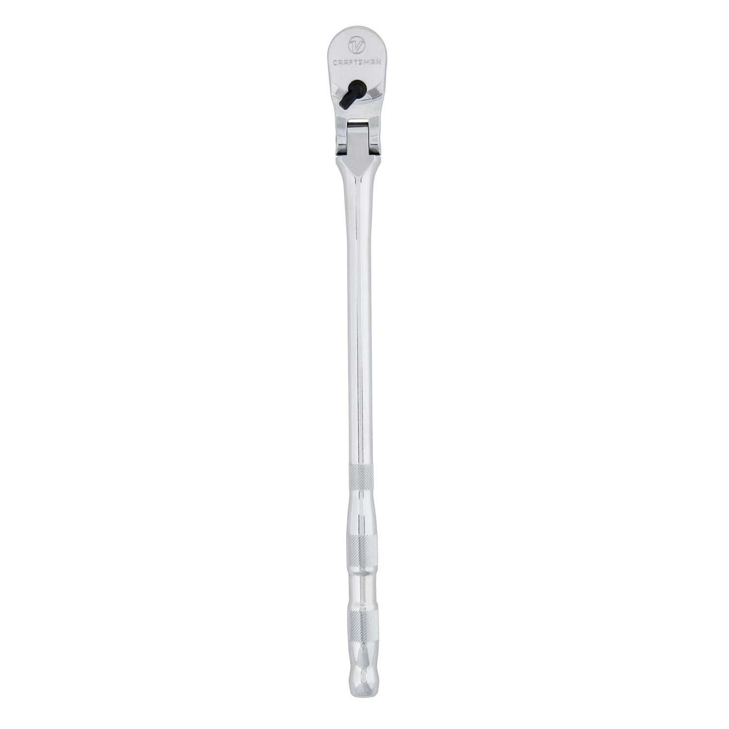 Complete every fastening project with pride as the V-Series™ 1/2 in. Drive Long Flex Head Ratchet provides the durability and dependability you need for daily work. Long-lasting performance and pro-grade usability are delivered by a precision-engineered gear for expert results each time. Reach fasteners that are difficult to access without losing grip strength with this ratchet’s 96-tooth construction and 3-3/4 arc swing. Productivity is easily maintainable with the help of the 180° articulating head that adjusts for enhanced reach. ACCESS CONFINED SPACES with 3-3/4 deg arc swing MAINTAIN PRODUCTIVITY with a 180 deg Articulating Head that helps you grip hard-to-reach fasteners BUILT FOR STRENGTH AND DURABILITY with precision-engineered gears PREVENTS DAMAGE FROM DIRT infiltration with enclosed head design BACKED BY A LIFETIME WARRANTY: Designed to deliver the quality and durability expected from the CRAFTSMAN brand – if the product fails to perform, we’ll replace it