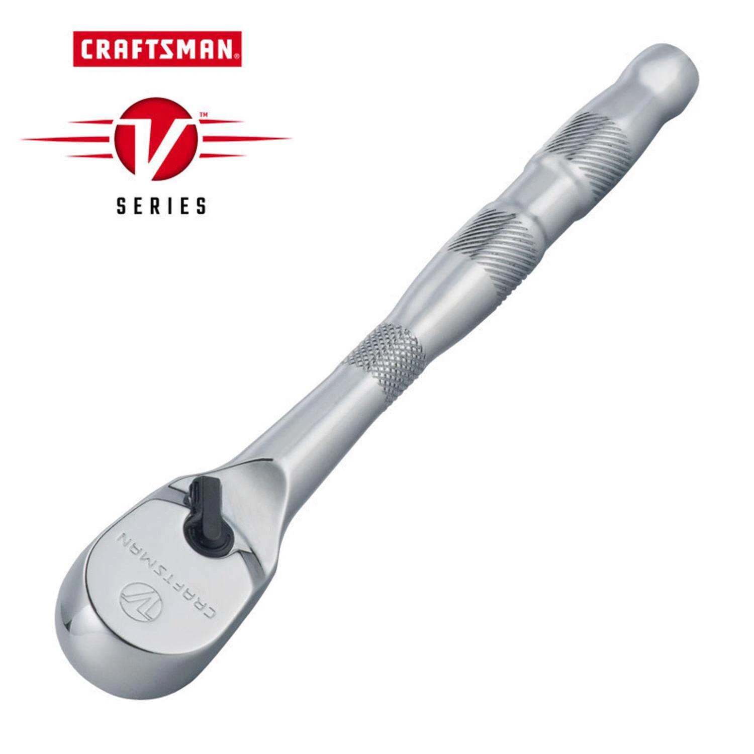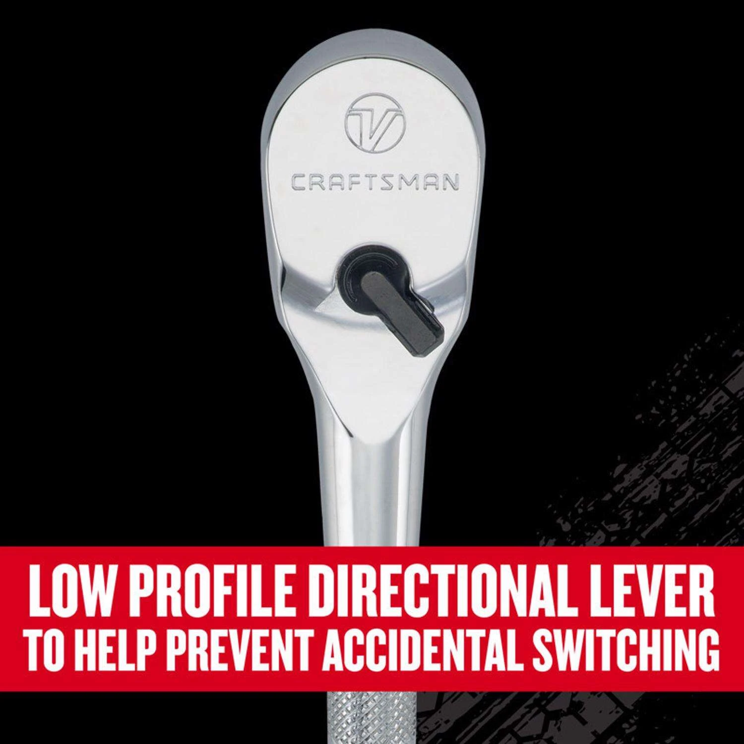 Get the endurance and reliability you need to take on daily fastening work with this V-Series™ 1/2 in. Drive Ratchet. Improved tool life and durability is delivered by expert-tested construction that features precision-engineered gear for optimized performance. Reach fasteners in the tightest of spaces without giving up grip strength with this ratchet’s 96-tooth design and short 3-3/4° arc swing while the low-profile directional lever prevents accidental switching. ACCESS CONFINED SPACES with 3-3/4° arc swing PREVENT UNINTENTIONAL SWITCHING with low-profile steering lever BUILT FOR STRENGTH AND DURABILITY with precision-engineered gears PREVENTS DAMAGE FROM DIRT infiltration with enclosed head design BACKED BY A LIFETIME WARRANTY: Designed to deliver the quality and durability expected from the CRAFTSMAN brand – if the product fails to perform, we’ll replace it