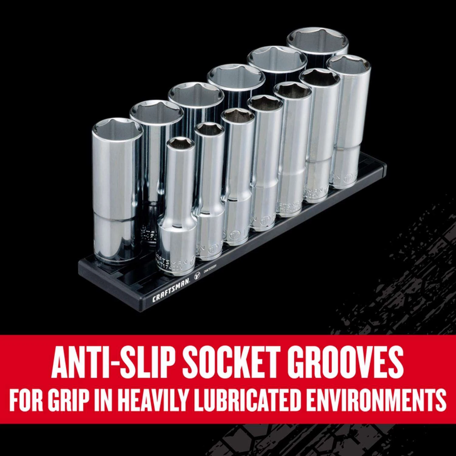 | What's Included | (13) 1/2 in. Drive 6 Point Deep Sockets – 3/8 in., 7/16 in., 1/2 in., 9/16 in., 5/8 in., 11/16 in., 3/4 in., 13/16 in., 7/8 in., 15/16 in., 1 in., 1-1/16 in., 1-1/8 in., and an 8 in., Double Black Rail with 13 Nubs |