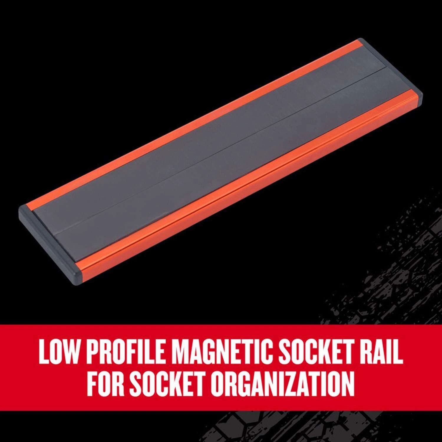 | What's Included | (1) Orange 1/4 in. Drive 8 in. Single Row Magnetic Socket Rail with 10 Nubs, (1) Orange 3/8 in. Drive 8 in. Triple Row Magnetic Socket Rail with 10 Nubs and (1) Orange 1/2 in. Drive 10 in. Triple Row Magnetic Socket Rail with 10 Nubs |