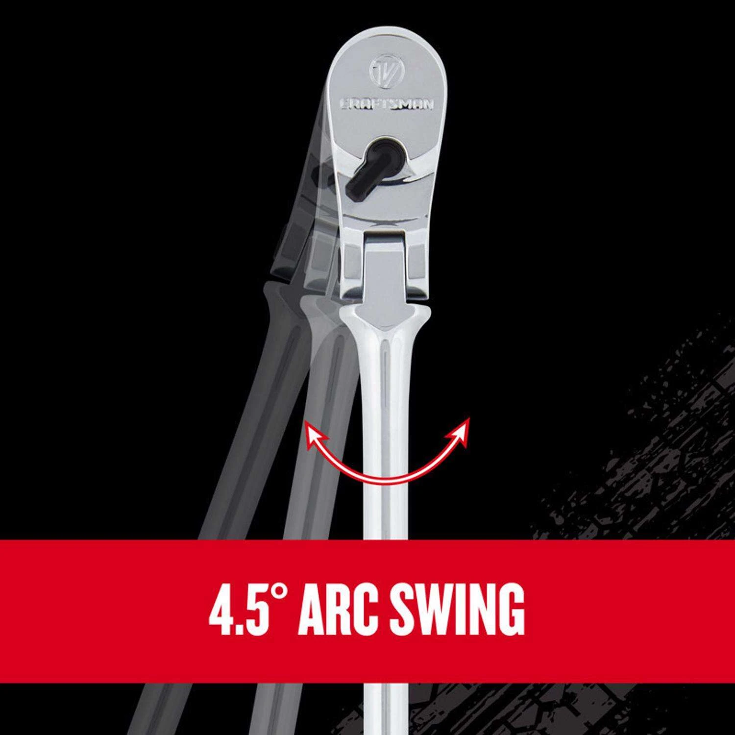 A precision-engineered gear equips this hard-wearing V-Series™ 1/4 in. Drive Long Flex Head Ratchet with the durability you need on the jobsite. Accessing hard-to-reach spots is no problem for this ratchet with its short 4-1/2 arc swing and 80-tooth design that helps maintain grip strength in confined spaces. An enclosed head design prevents dirt and other particles from infiltrating the tool’s interior and shortening its lifespan. ACCESS CONFINED SPACES with 4-1/2° arc swing MAINTAIN PRODUCTIVITY with a 180° Articulating Head that helps you grip hard-to-reach fasteners BUILT FOR STRENGTH AND DURABILITY with precision-engineered gears PREVENTS DAMAGE FROM DIRT infiltration with enclosed head design BACKED BY A LIFETIME WARRANTY: Designed to deliver the quality and durability expected from the CRAFTSMAN brand – if the product fails to perform, we’ll replace it