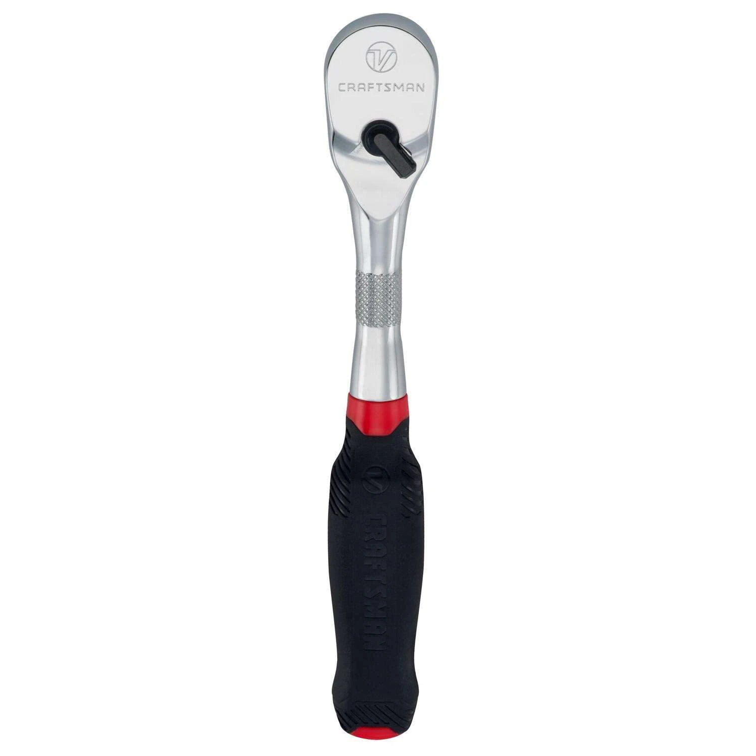 Perfect for routine fastening work, this V-Series™ 3/8 in. Drive Comfort Grip Ratchet delivers the reliability and durability you need in the garage or workspace. Easily access difficult-to-reach fasteners with the 180° articulating head and optimize your efficiency with precision-engineered gear. Regardless of the angle you work from, grip strength can be fully maintained with this ratchet’s 96-tooth design and short 3-3/4 arc swing for work in tight spaces. For professional operability, less accidental switching is made possible with the tool’s low-profile directional lever. ACCESS CONFINED SPACES with 3-3/4 deg arc swing MAINTAIN PRODUCTIVITY with a 180 deg Articulating Head that helps you grip hard-to-reach fasteners COMFORTABLE GRIP: Bi-material handle lessens hand strain PREVENTS DAMAGE FROM DIRT infiltration with enclosed head design BACKED BY A LIFETIME WARRANTY: Designed to deliver the quality and durability expected from the CRAFTSMAN brand – if the product fails to perform, we’ll replace it