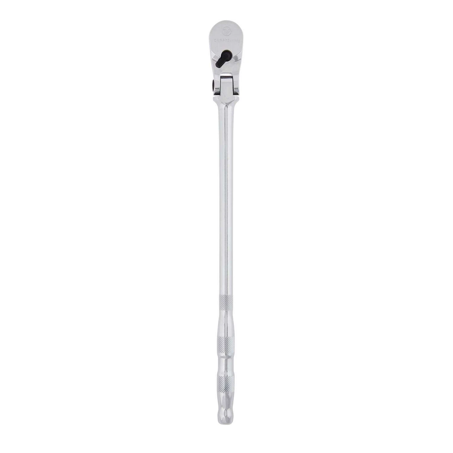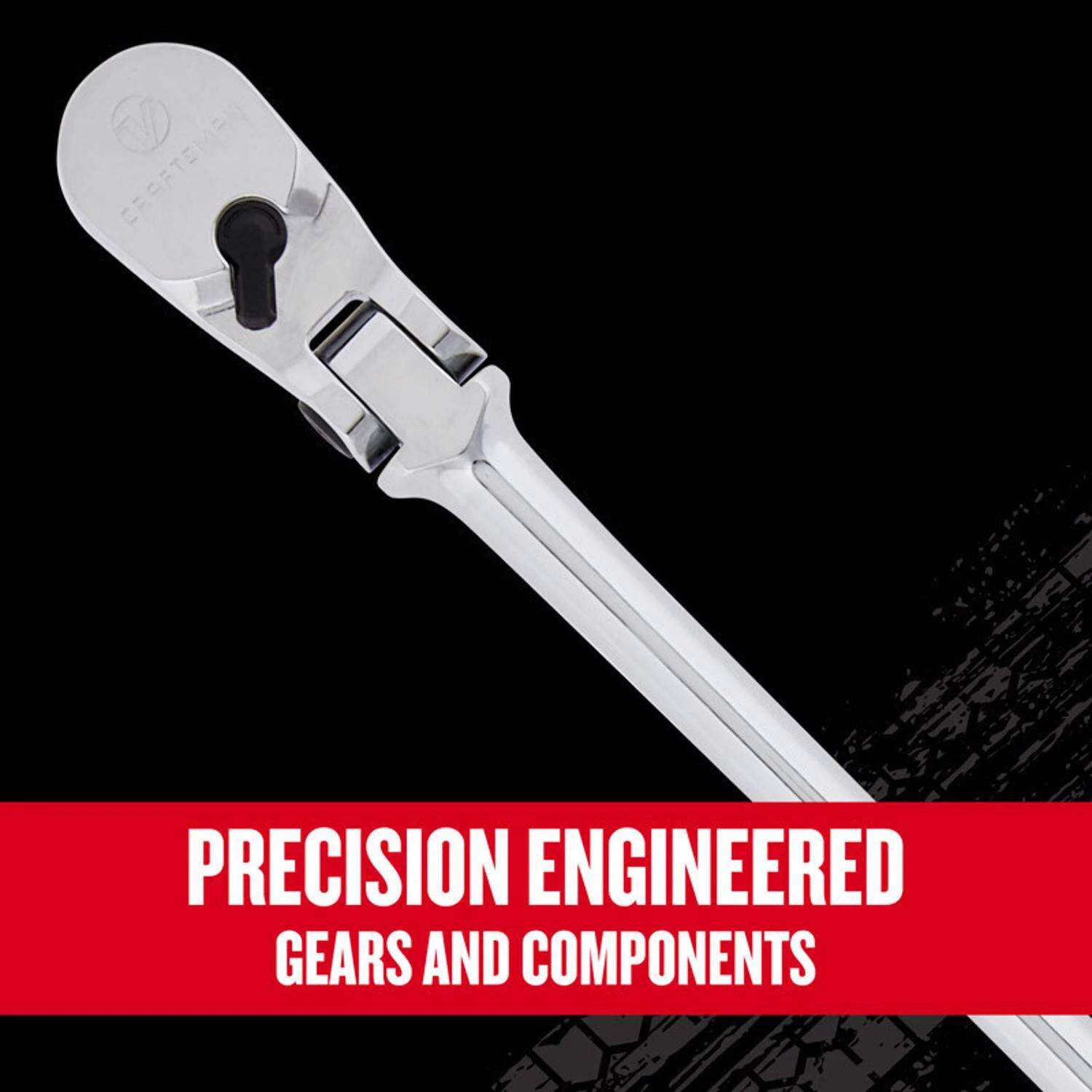 Ideal for daily fastening, this V-Series™ 3/8 in. Drive Long Flex Head Ratchet packs the durability and performance capacity you need on the jobsite. Highly easy to use, it helps you access hard-to-reach fasteners with its 180° articulating head and precision-engineered gear. Maintain grip strength no matter what angle you work from with its 96-tooth design and its short 3-3/4″ arc swing that enhances reach in tight spaces. Keep a smooth workflow and lessen accidental switching with the ratchet’s low-profile directional lever. ACCESS CONFINED SPACES with 3-3/4″ arc swing MAINTAIN PRODUCTIVITY with a 180 degree Articulating Head that helps you grip hard-to-reach fasteners BUILT FOR STRENGTH AND DURABILITY with precision-engineered gear PREVENTS DAMAGE FROM DIRT infiltration with enclosed head design BACKED BY A LIFETIME WARRANTY: Designed to deliver the quality and durability expected from the CRAFTSMAN brand – if the product fails to perform, we’ll replace it
