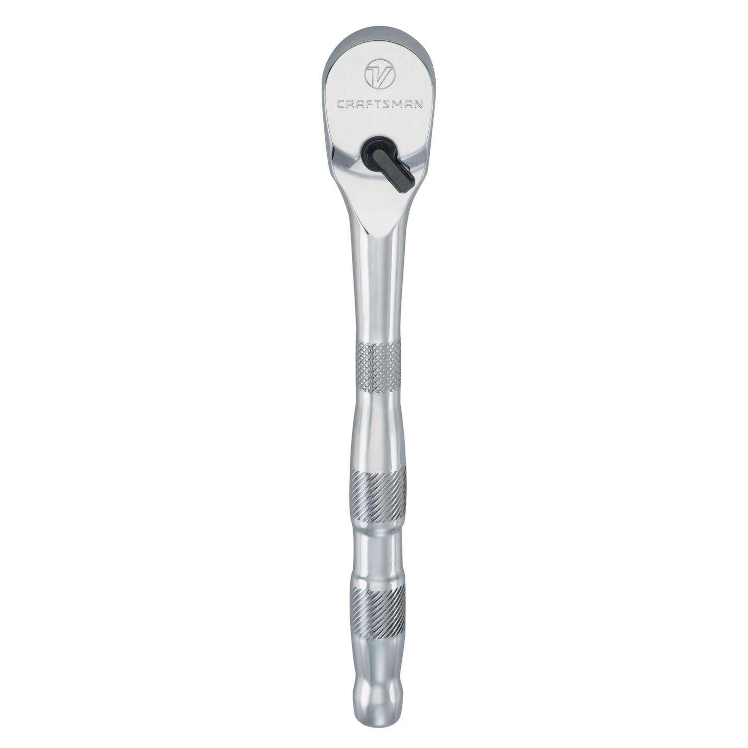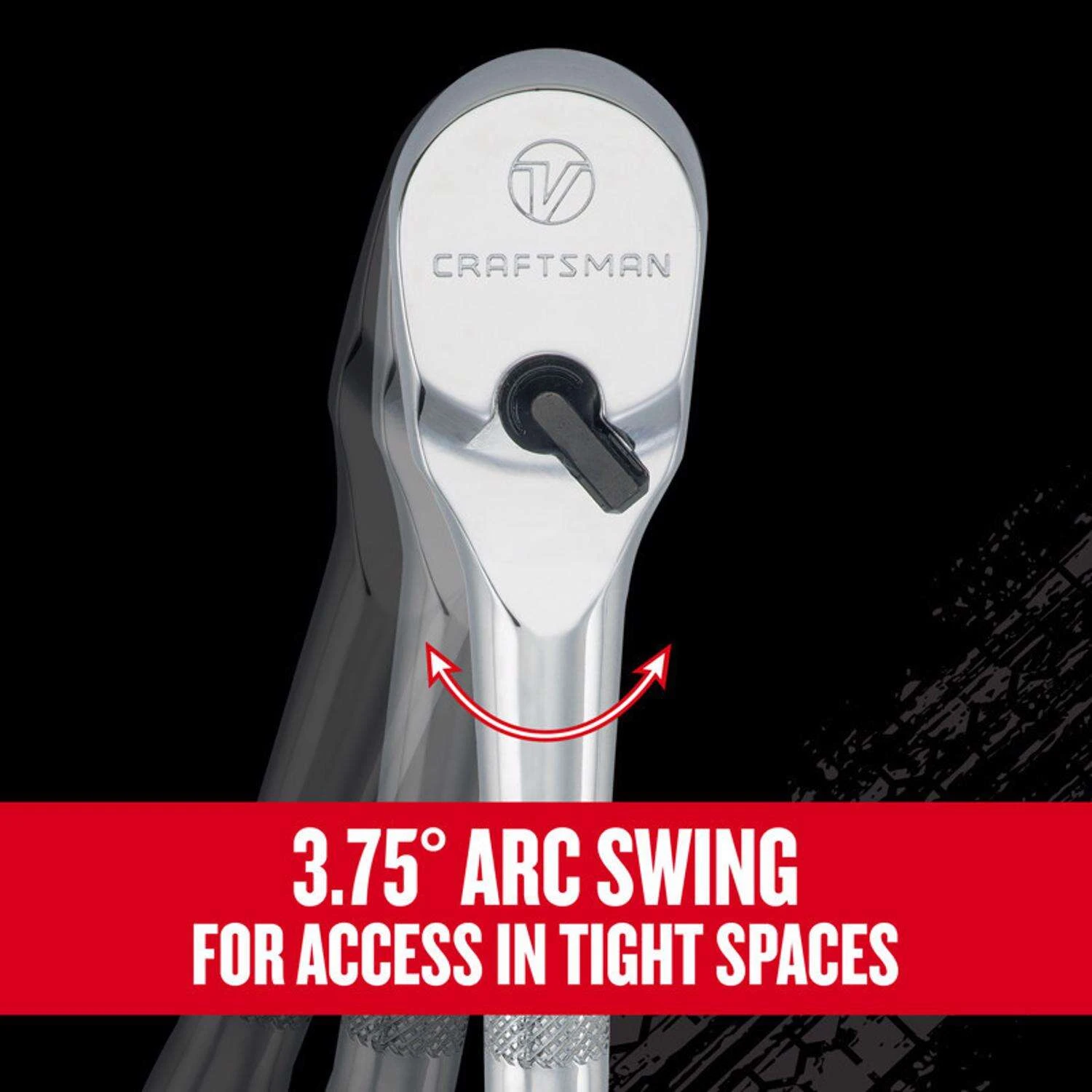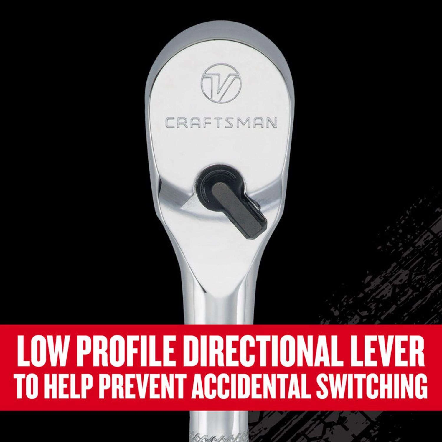 Tackle demanding projects with this V-Series™ 3/8 in. Drive Ratchet. This ratchet blends pro-grade performance and expert-tested endurance with a precision-engineered gear for optimized usability. Access confined work areas without losing grip strength with the 96-tooth design along with its short 3-3/4 arc swing. This tool was designed to minimize accidental switching for enhanced productivity with its low-profile directional lever. ACCESS CONFINED SPACES with 3-3/4 deg arc swing PREVENT UNINTENTIONAL SWITCHING with low-profile steering lever BUILT FOR STRENGTH AND DURABILITY with precision-engineered gear PREVENTS DAMAGE FROM DIRT infiltration with enclosed head design BACKED BY A LIFETIME WARRANTY: Designed to deliver the quality and durability expected from the CRAFTSMAN brand – if the product fails to perform, we’ll replace it