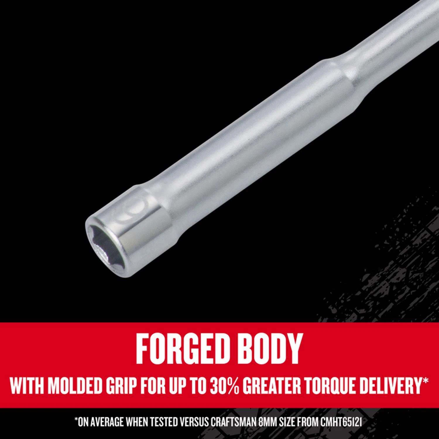 The Craftsman® V-Series 6pc Metric Nut Driver Set leverages a forged steel body and sturdy over-molded grip to deliver up to 30% greater torque. The handles are designed with the mechanic in mind blending precision, torque and control, with a soft touch material that offers comfort and verified 2x protection against the most common garage solvents. The 6-point design helps maximize fastener contact with a deep opening for clearing longer threads. UP TO 30% MORE TORQUE – Forged body with molded grip for up to 30% greater torque delivery VERIFIED 2X SOLVENT PROTECTION – Soft touch grip wit 2x solvent protection PRO-HANDLE DESIGN – Blends precision, torque and control 6 POINT SOCKET – With deep opening for long threads