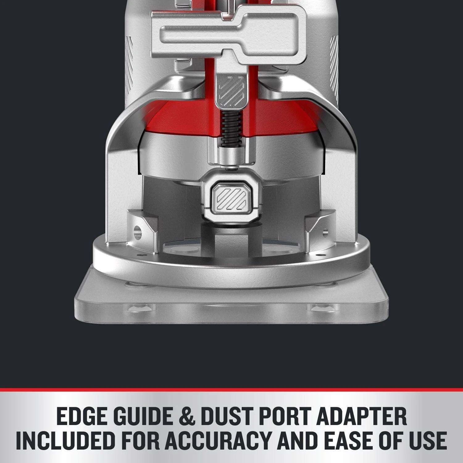 This lightweight Shell Craftsman V20 Brushless RP Router features a slim profile design and a brushless motor to provide the user with a powerful, compact solution for all fixed-base routing applications. The variable-speed dial allows the user to select from 7 speeds ranging from 16,000-30,000 RPM for better control and versatility with various applications. The CMCW400 also includes both macro and micro depth adjust features, allowing the user the make quick and precise depth adjustments. The LED light helps to illuminate work surfaces and provide superior bit visibility while the included edge guide assists the user in skillfully carrying out applications where accuracy matters. Variable speed dial – allows user to control speed from 16000-30 000 rpm for various applications Brushless motor – powerful motor provides greater performance and longer runtime Depth adjustment knob – allows for fast and easy height adjustments