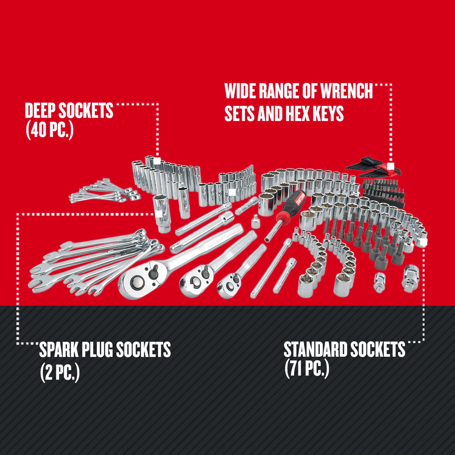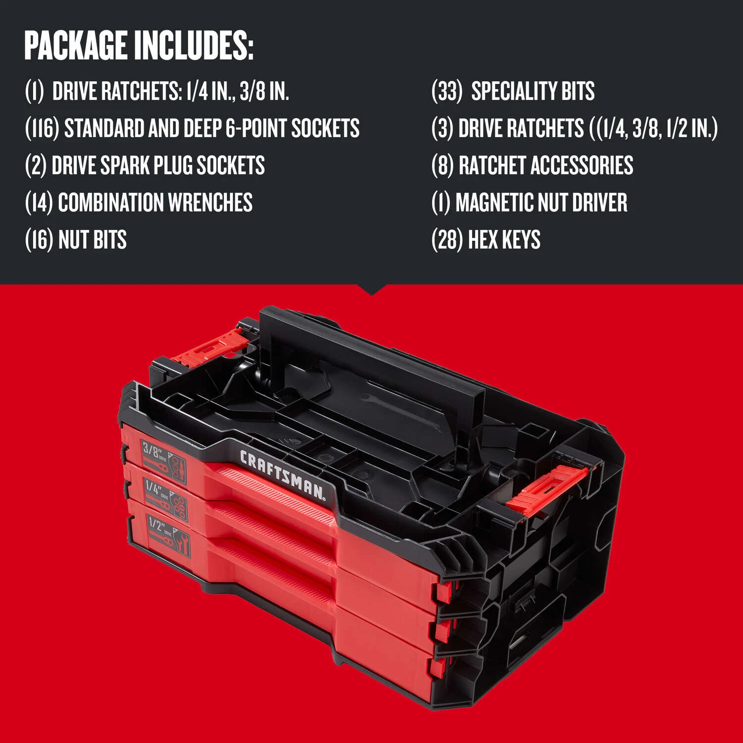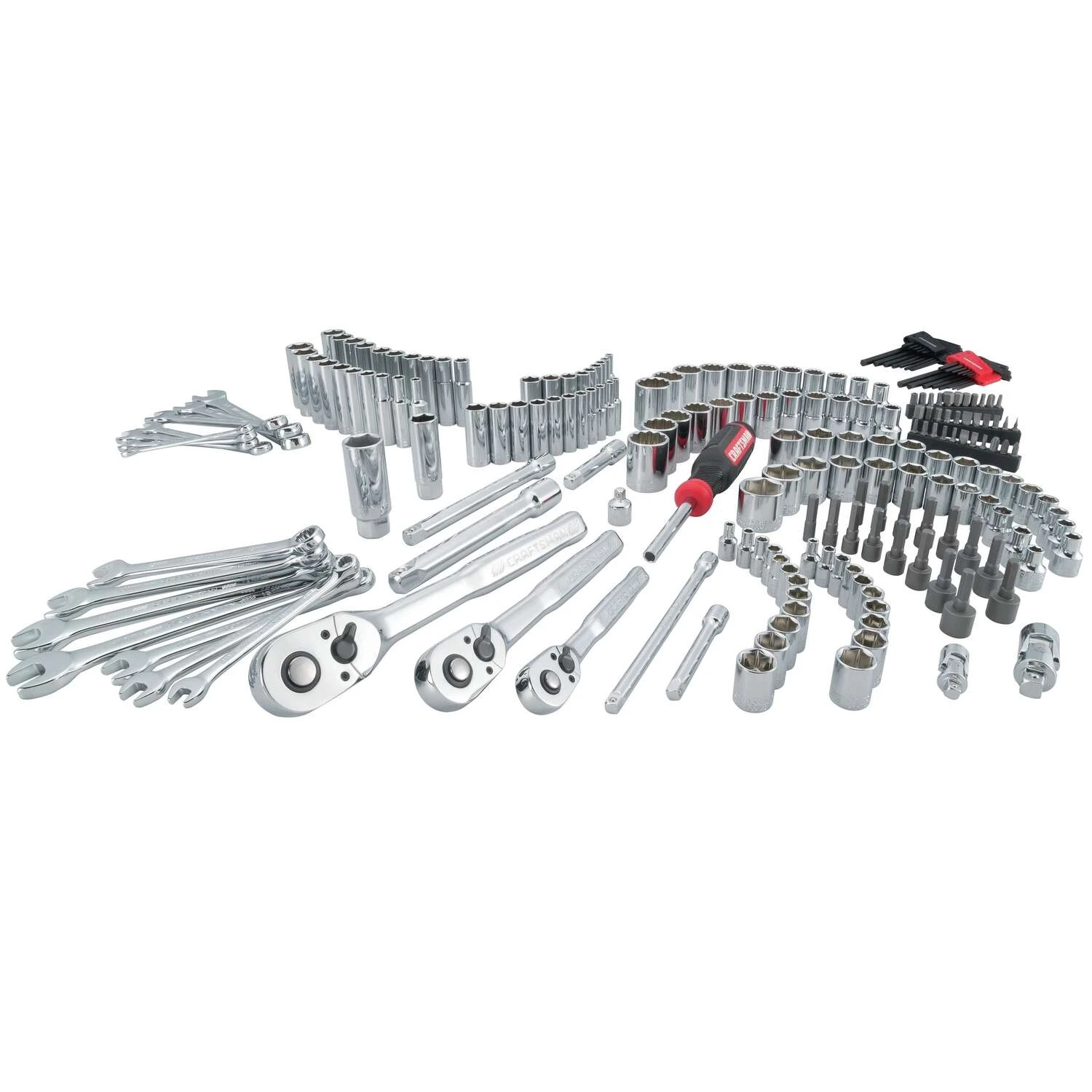 | What's Included | (3) Drive Ratchets: 1/4-in., 3/8-in. & 1/2-in. (111) Standard and Deep 6-Point Sockets (2) 3/8" Drive Spark Plug Sockets (8) Ratchet Accessories (14) Combination Wrenches (1) Magnetic Nut Driver (16) Nut Bits (28) Hex Keys (33) Specialty Bits |