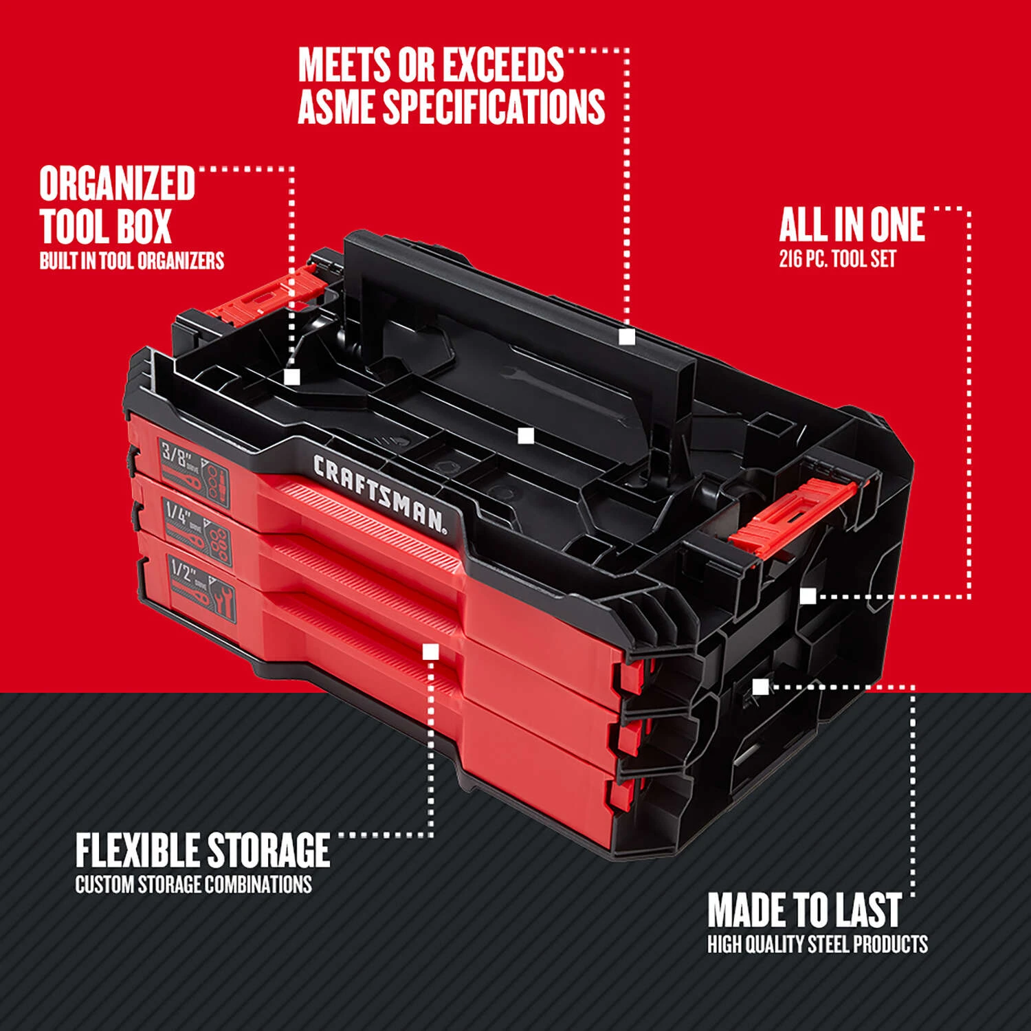 Be the first to review “Craftsman VersaStack 1/4, 3/8 And 1/2 In. Drive Metric And SAE 6 Point Mechanic’s Tool Set 216 Pc” Cancel reply
