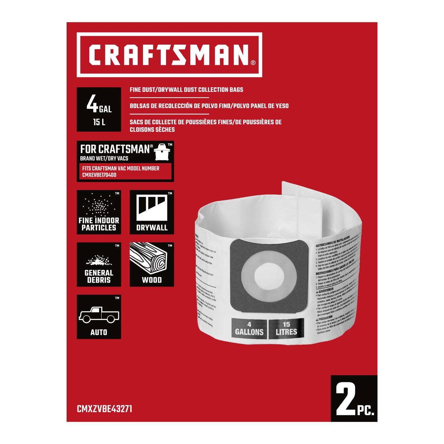 When you’re finished sanding down that woodworking project or drilling out holes in metal piping, you don’t want to be stuck sweeping up the leftovers. Suck it up with your Craftsman wet/dry vac and trap debris conveniently with dust collection bags for easy disposal. The 4-gallon fine dust/drywall dust collection bags for wet/dry vacs are designed for the pick-up of drywall dust, cold ashes, ultra-fine particles, and other dry debris pick-up. Reduce clean-up time: vacuum bag makes debris disposal quick and easy, reducing the time required to clean the wet/dry vac. FITS: 4 gallon CRAFTSMAN Wet/Dry Shop Vacuum model CMXEVBE17040 * DOES NOT FIT: 4 gallon CRAFTSMAN Wet/Dry Vac model CMXEVBE17612 * DESIGNED FOR DRY PICK-UP: Dust bag for dry debris pick-up only to make clean-up fast and easy. Remove dust filter bag if picking up wet messes * COLLECTS EVERYDAY DIRT: Dust bag designed for capturing everyday debris such as lint, dirt, dust, small food particles, leaves, sawdust, and other dry messes * HASSLE FREE INSTALLATION: Unlatch the motor cover, open the dust bag, slide the bag’s collar opening over the inlet, make sure the dust bag is secured on the inlet ribs, replace the motor cover and start cleaning REDUCE CLEAN-UP TIME: Vacuum bag makes debris disposal quick and easy, reducing the time required to clean the wet dry vacuum cleaner * INCLUDES: 2 dust bags