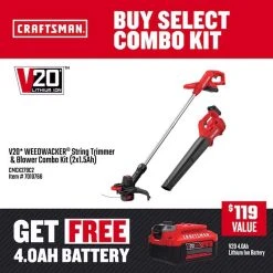 Craftsman V20 BRUSHLESS RP CMCK497P1 13 In. 20 V Battery String Trimmer Kit (Battery & Charger)